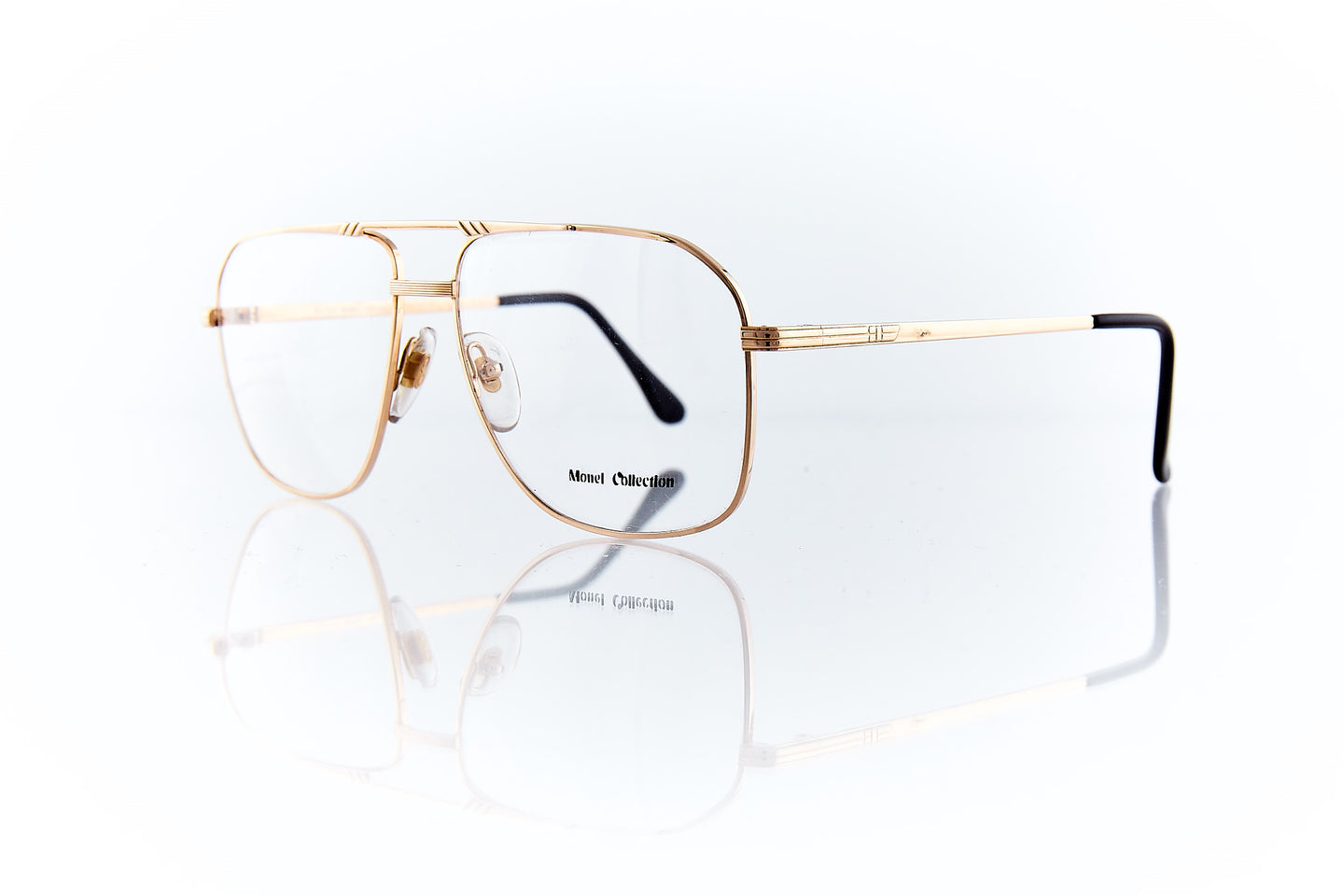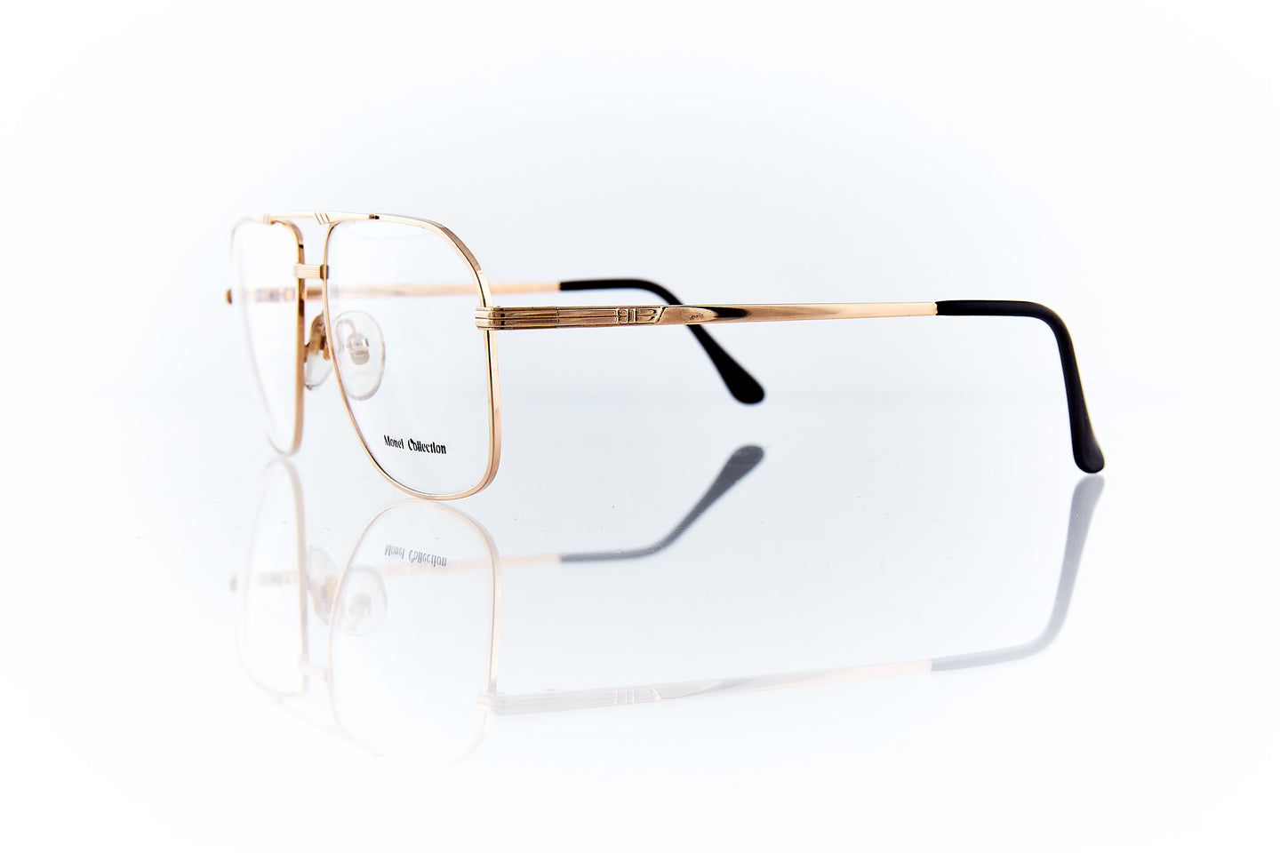 SHINY GOLD FRAME WITH NOSE BRIDGE ENGRAVINGS WITH ENGRAVING RUNNING THROUGH FRAME HINGE AND TEMPLE