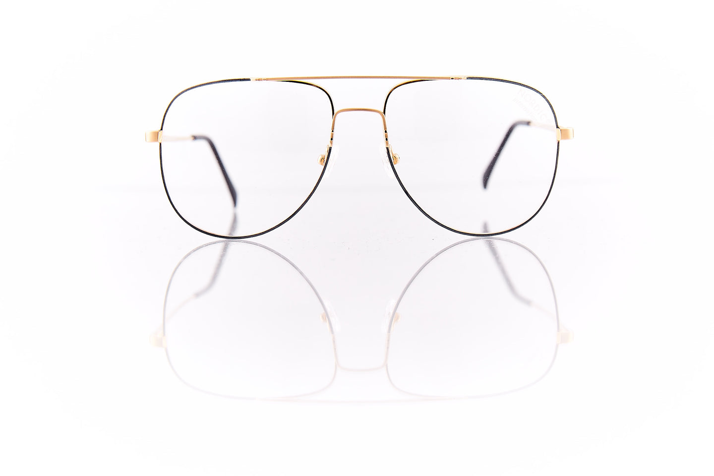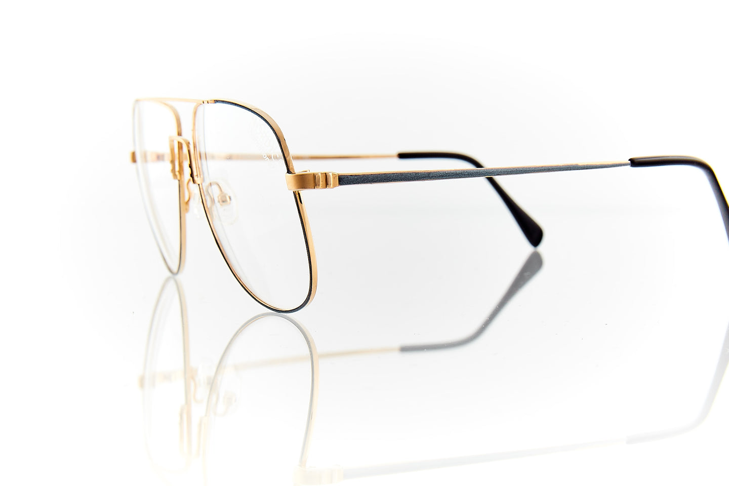 GREY & GOLD FRAME WITH DOUBLE NOSE BRIDGE . ENGRAVING RUNNING THROUGH FRAME HINGE WITH GREY TEMPLE