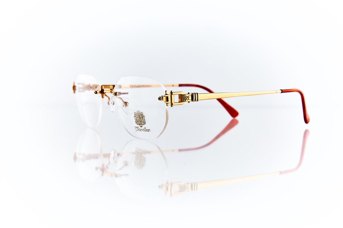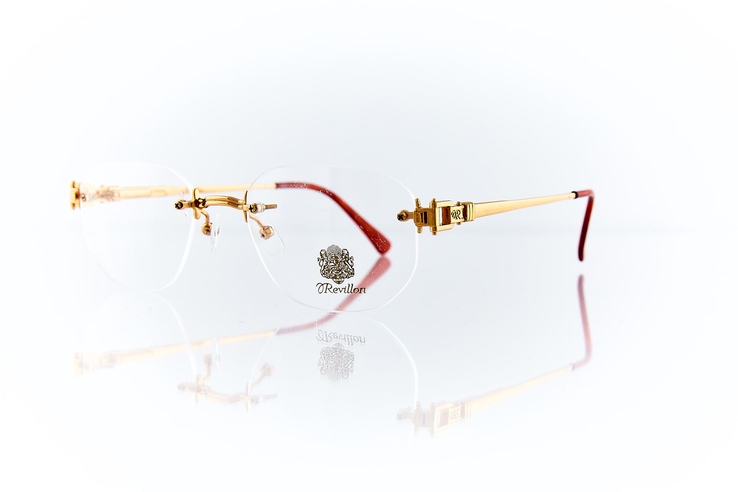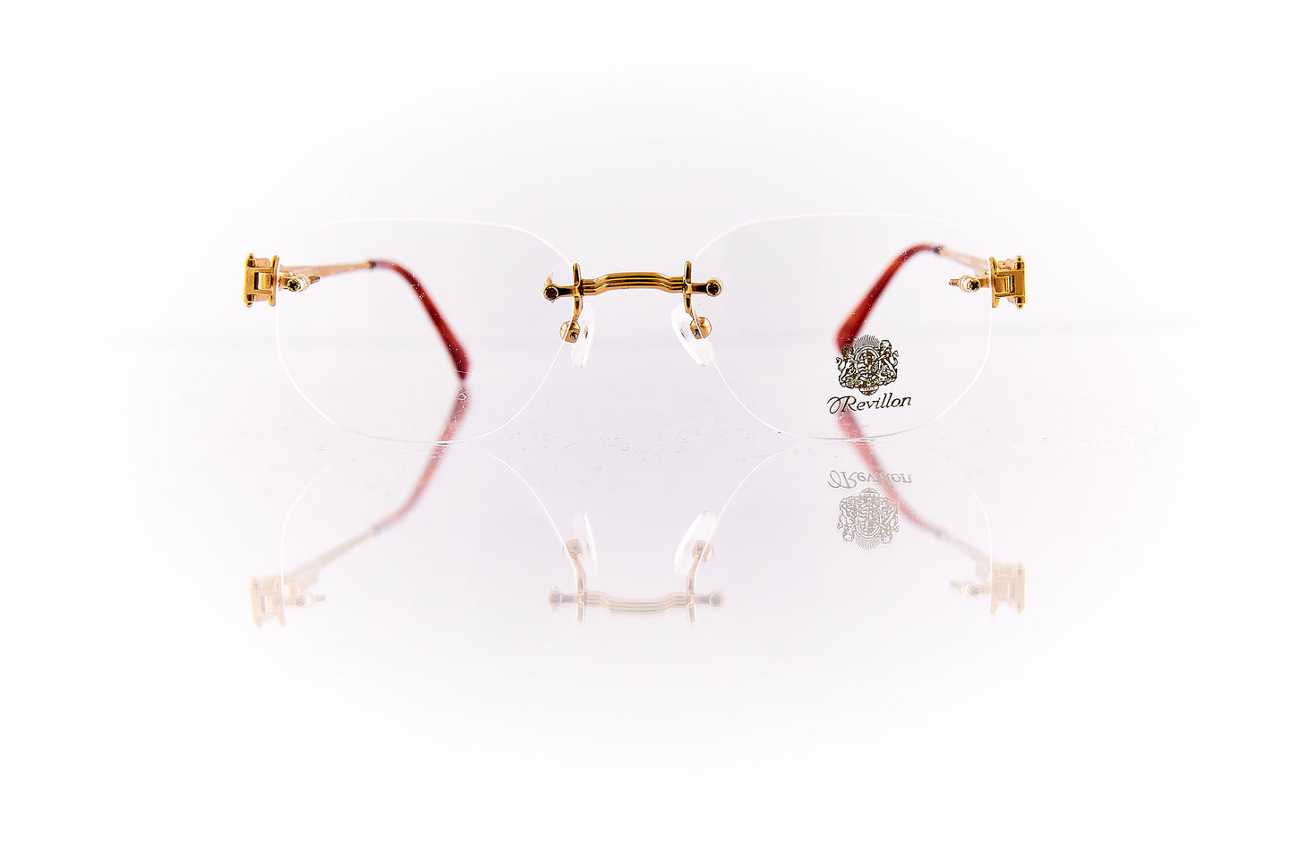 SHINY GOLD FRAME WITH NOSE BRIDGE ENGRAVINGS WITH ENGRAVING RUNNING THROUGH FRAME HINGE AND TEMPLE