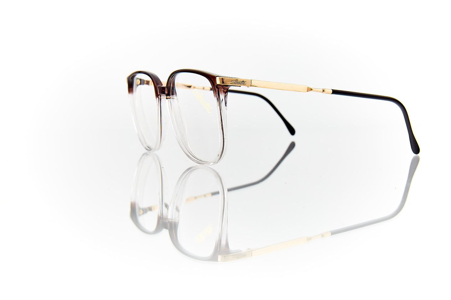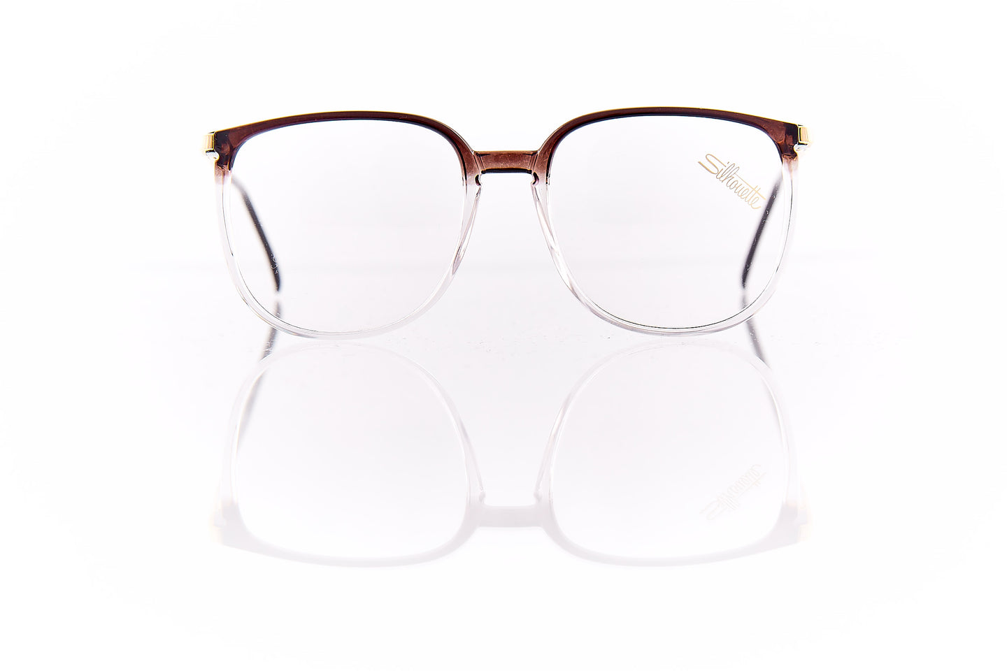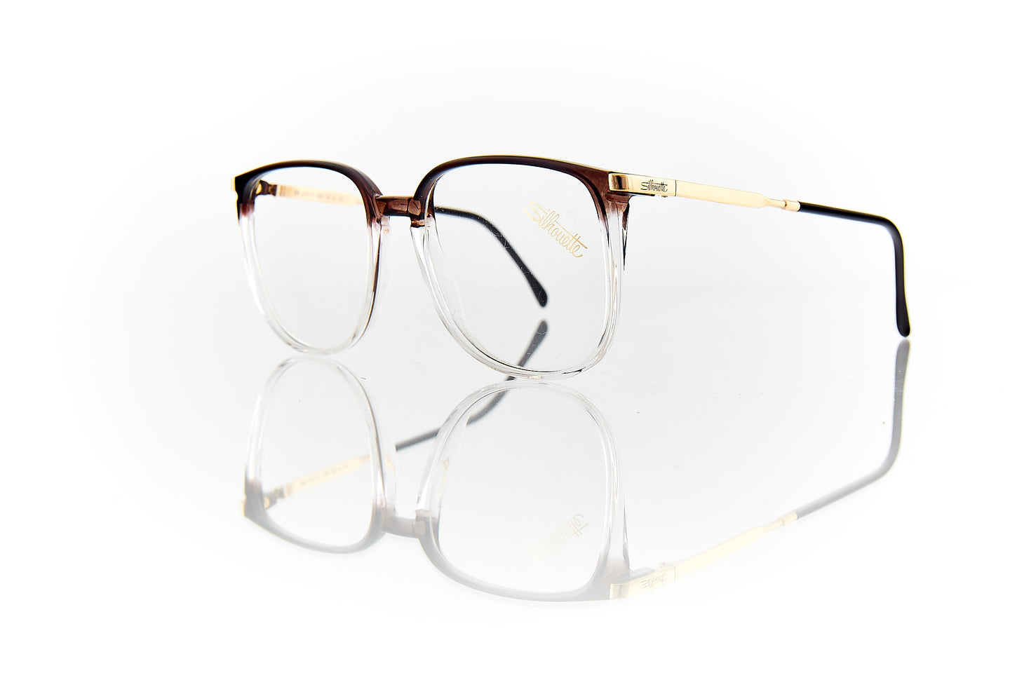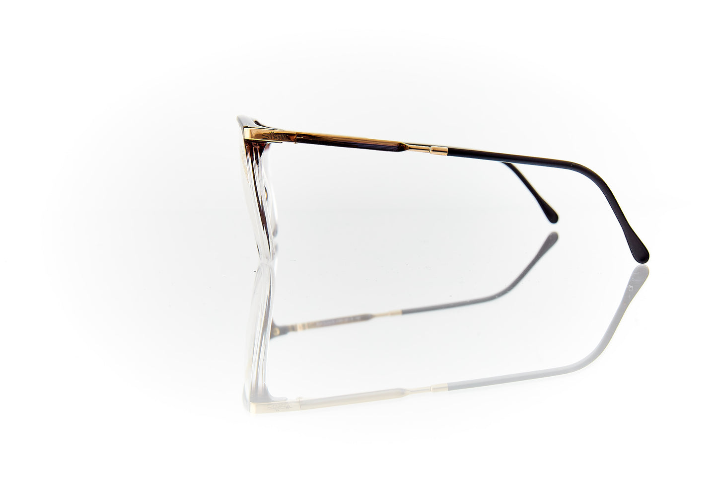 FADDED SMOKE COLORED FRAME WITH GOLD RUNNING THROUGH FRAME HINGE AND TEMPLE