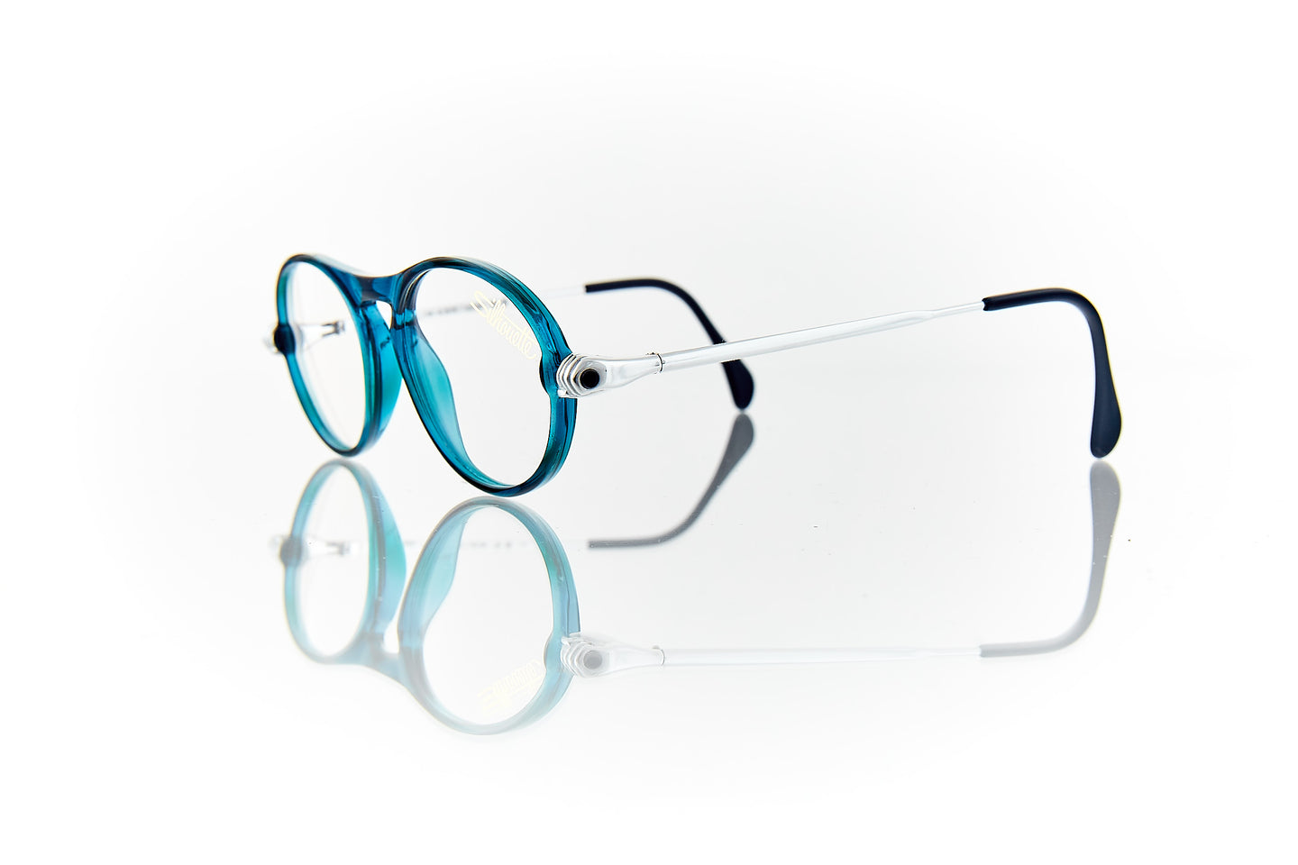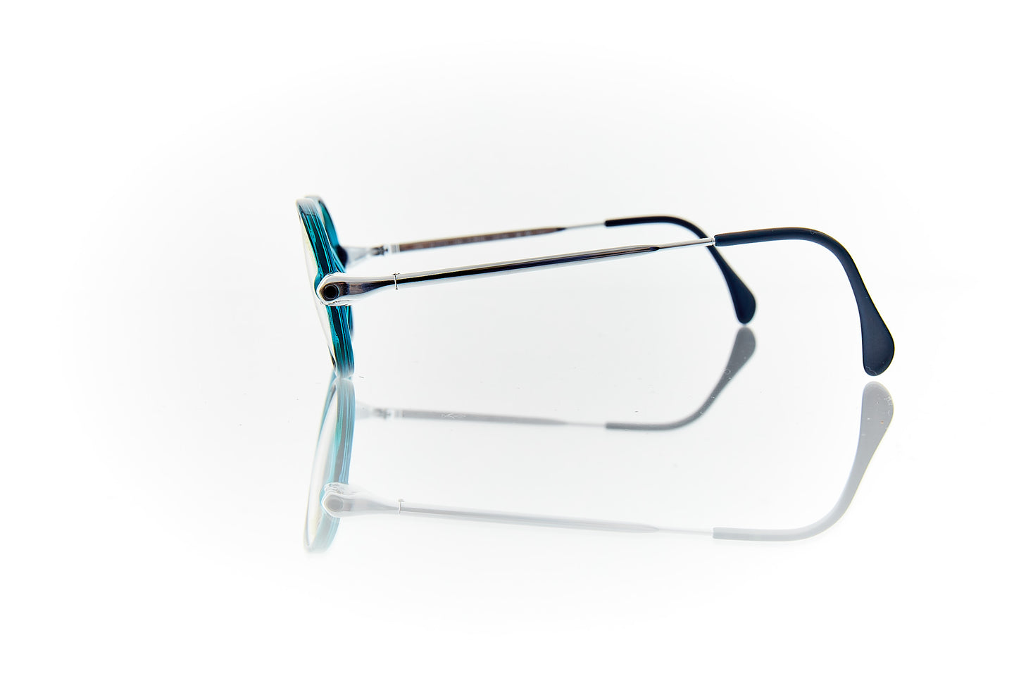 COOL WATER COLORED FRAME WITH SILVER FISTS RUNNING THROUGH FRAME HINGE AND TEMPLE