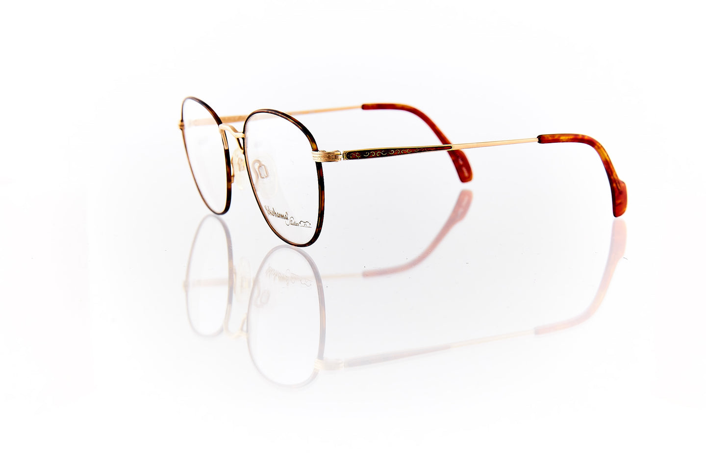 MATTE GOLD PAINTED FRAME WITH NOSE BRIDGE ENGRAVINGS & ENGRAVING RUNNING THROUGH FRAME HINGE AND TEMPLE