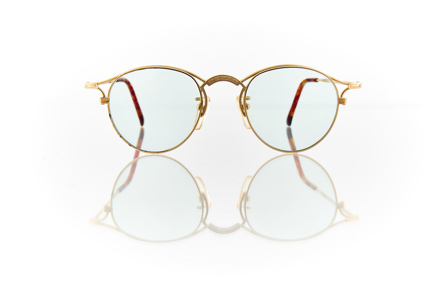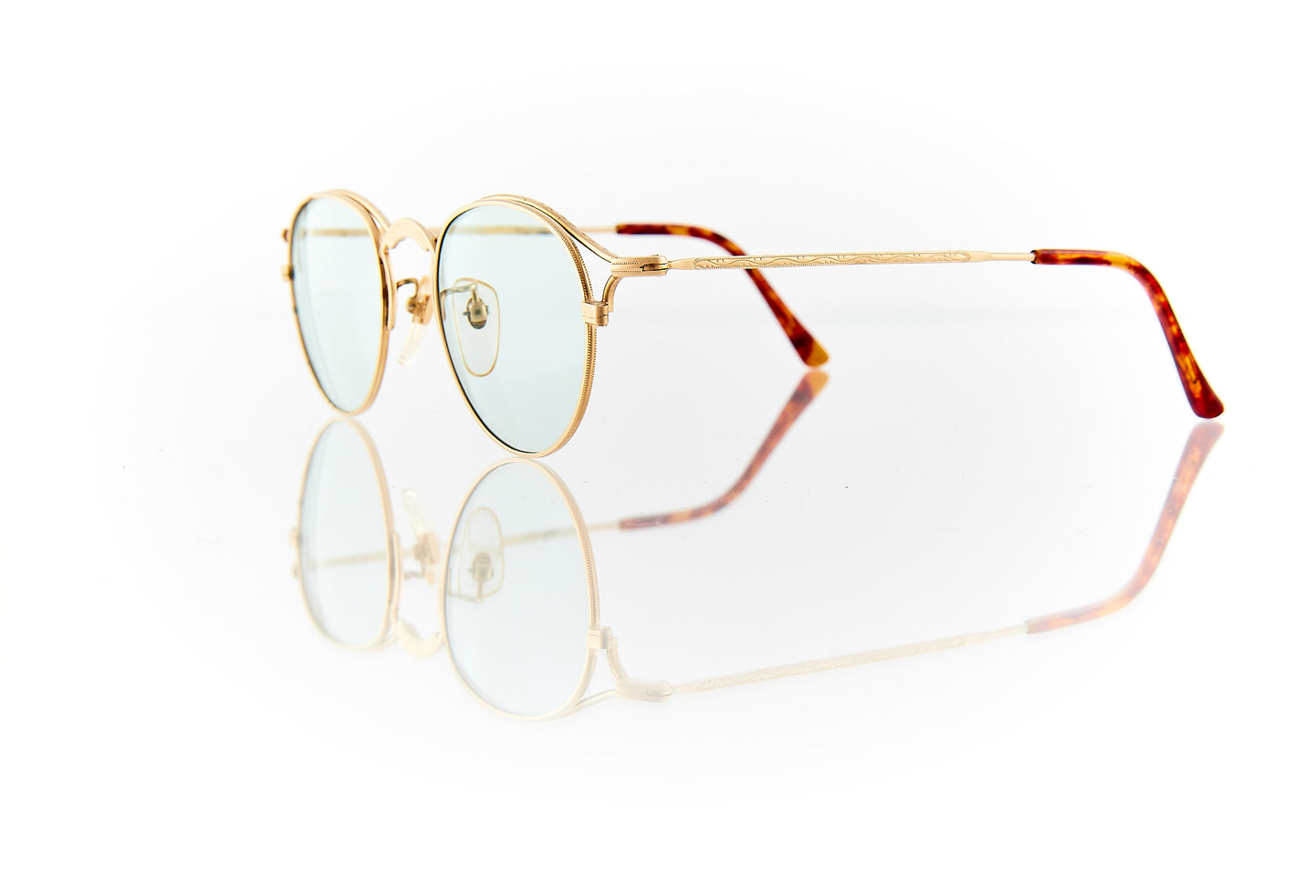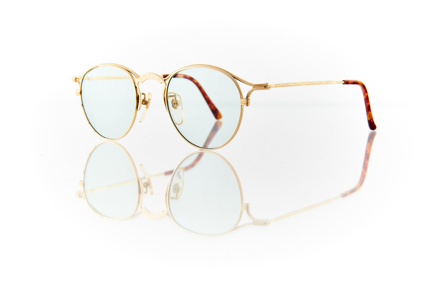 MATTE GOLD FRAME WITH NOSE BRIDGE ENGRAVINGS WITH ENGRAVING RUNNING THROUGH FRAME HINGE AND TEMPLE