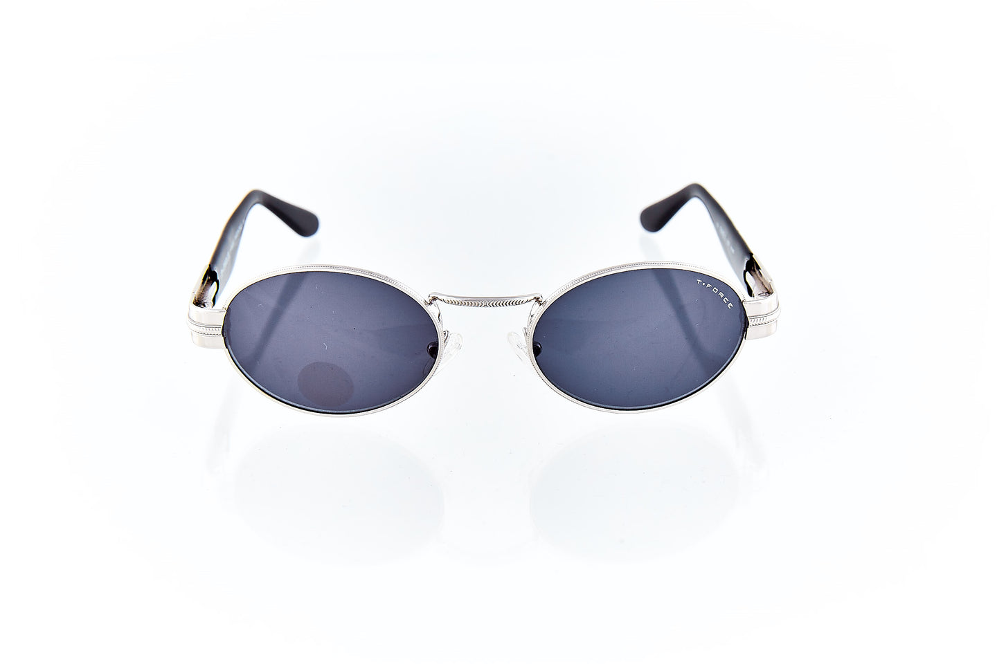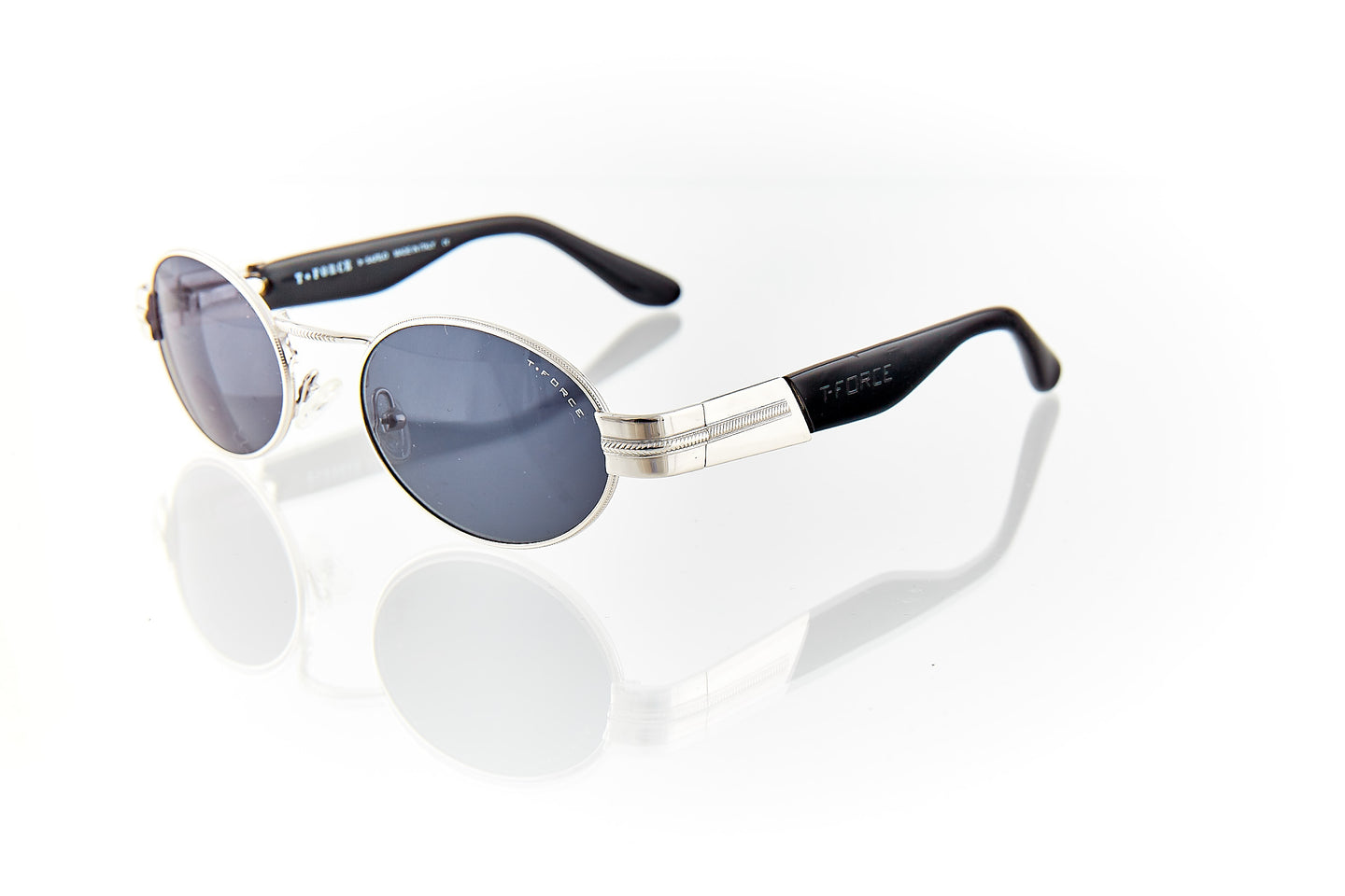 SHINY SILVER FRAME WITH NOSE BRIDGE ENGRAVINGS WITH ENGRAVING RUNNING THROUGH FRAME HINGE AND TEMPLE